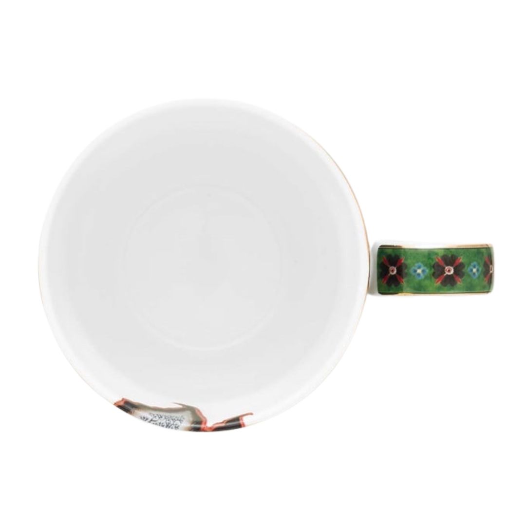 Diese große Tasse ist Teil der Flower Blues Kollektion. Die dunkelblauen und dunkelgrünen Farben verleihen der Tasse eine sehr warme und elegante Ausstrahlung. Die Tasse ist mit einem dunkelblauen Blumenmuster verziert, auf dem elegante Fantasieblumen und Beeren wachsen. Die Ränder sind mit goldenen Akzenten und einem überraschenden rot-weißen Streifen versehen, was der großen Tasse Flower Blues eine extra warme und gemütliche Ausstrahlung verleiht.