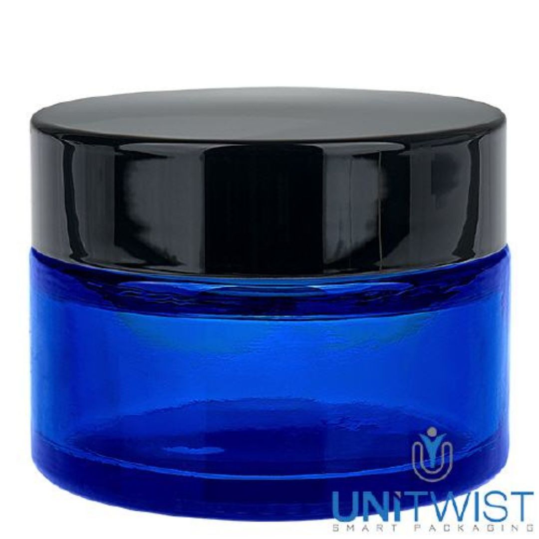 Blauer Glastiegel 30 ml mit schwarzem Deckel. Der Deckel schliesst luftdicht. Schwarzer Schraubverschluss mit weißer Einlegescheibe.