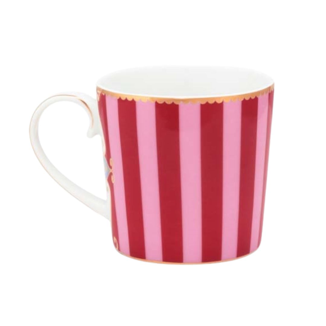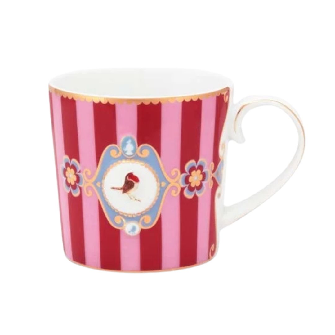 Eine kleine rot-rosa gestreifte porzellan Tasse mit Pips Lieblingsdesign, Love Birds. Diese Tasse ist versehen mit ein Medaillon und ein wunderschönes Rotkehlchen in der Mitte. Verziert mit goldene runde Elemente und ein Muster von Streifen und Formen. Jede Tasse ist dekoriert mit luxuriösen Elementen sowie goldenen Details am Griff.